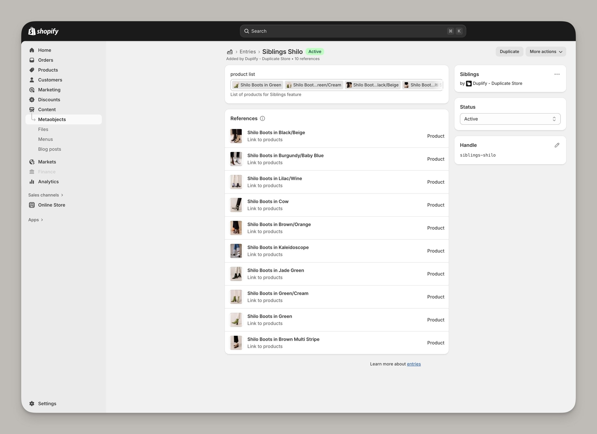 When using Metaobjects with Palo Alto, Siblings can be easily managed from the Content library in your Shopify Admin: