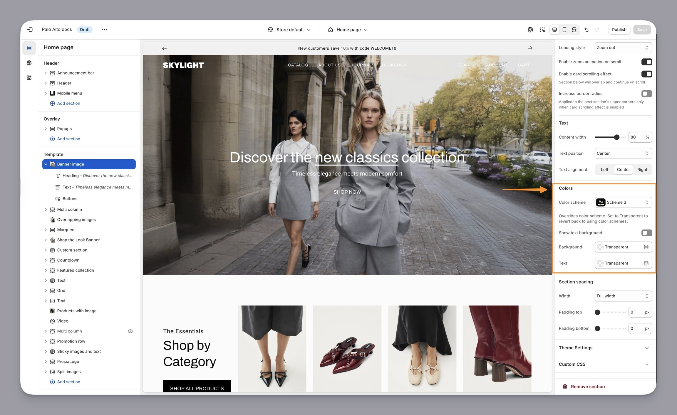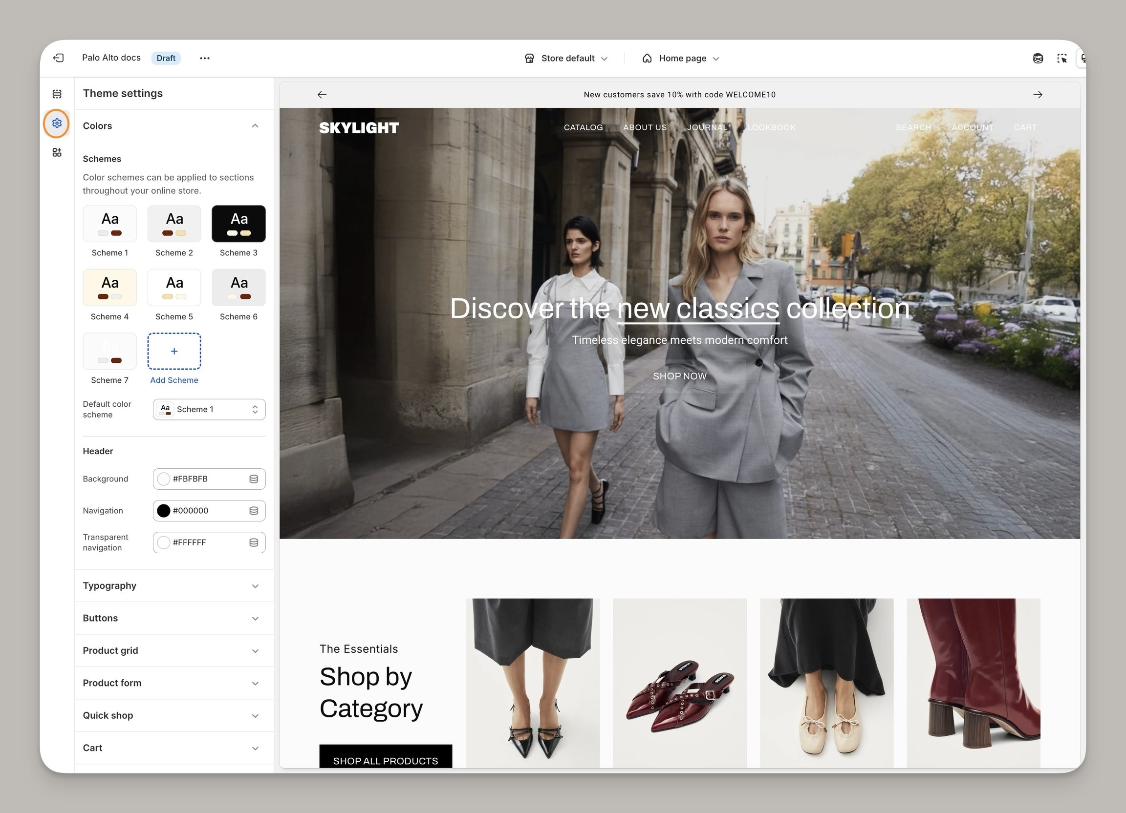 Palo Alto now includes Shopify's Color Schemes for managing colors throughout your theme: