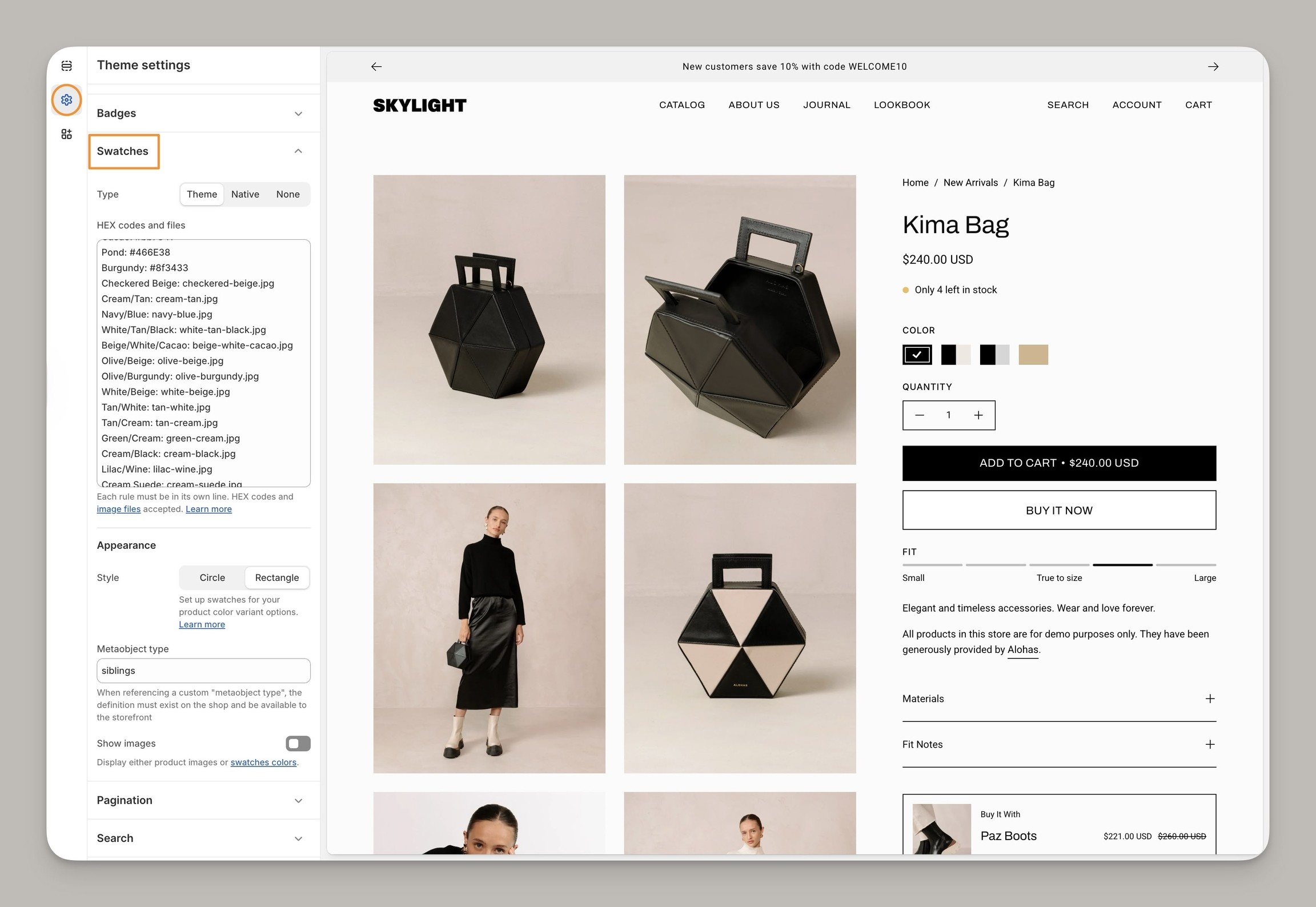 You can now manage custom HEX colors in the theme settings and also choose the swatch mode and shape: