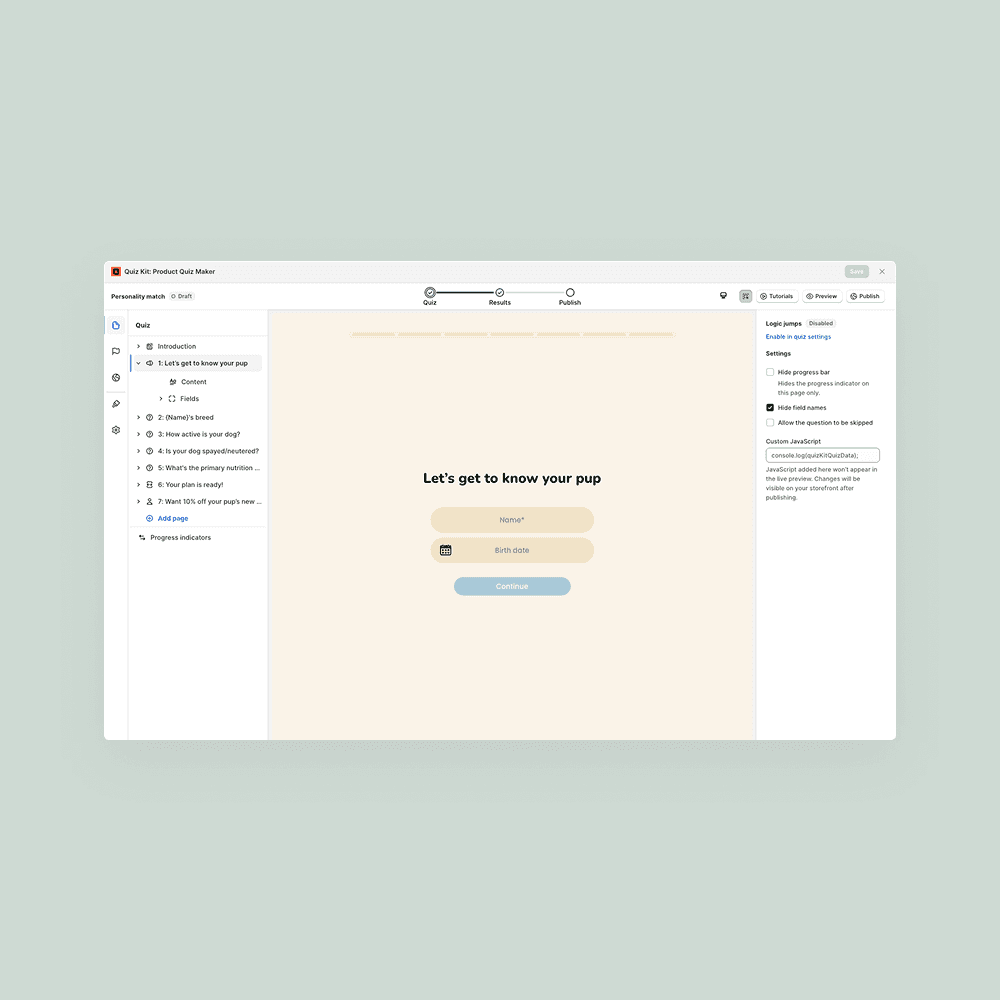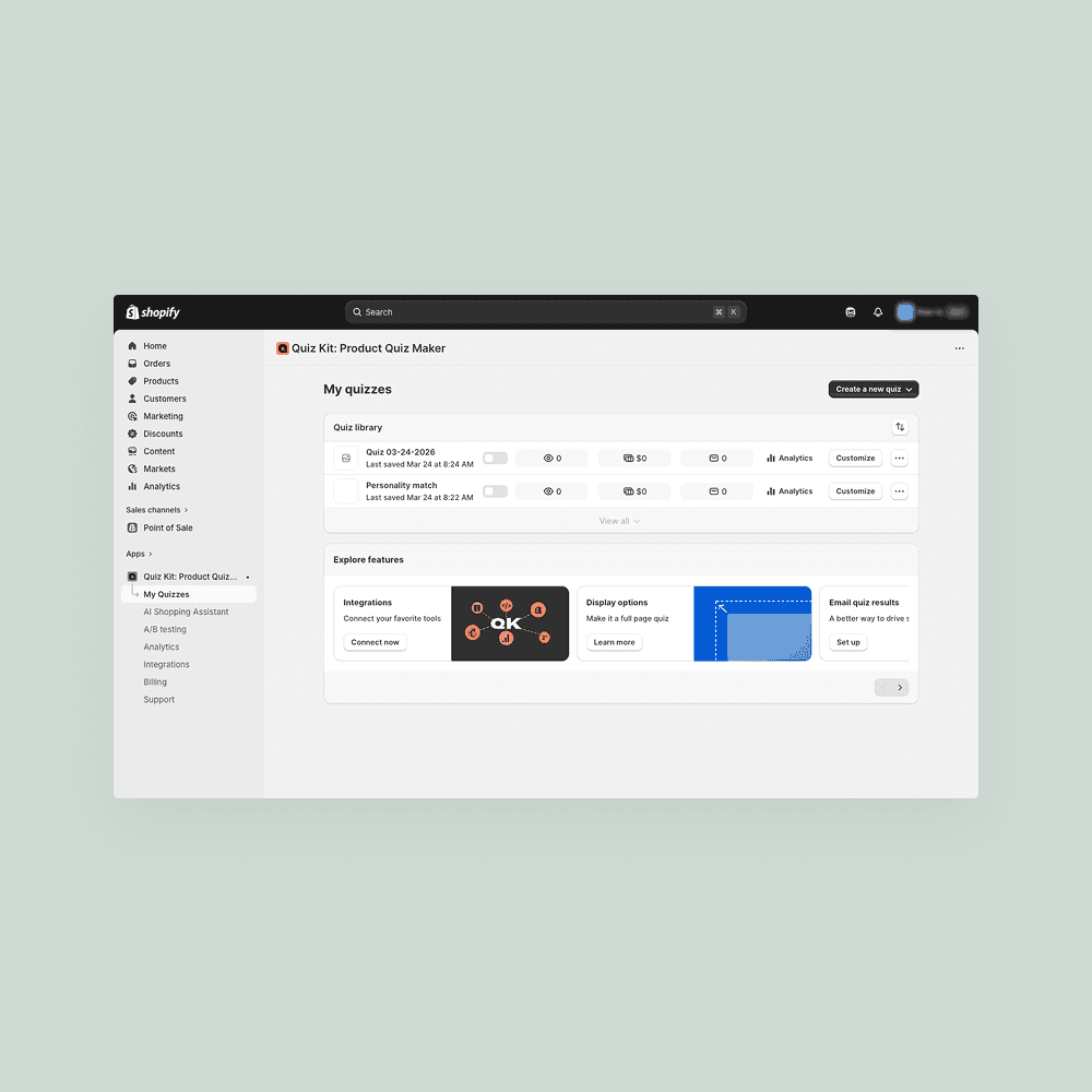 Quiz Kit now aligns more closely with Shopify’s native design system. Buttons and interface elements have been updated to feel more consistent with the Shopify admin, creating a more familiar experience for teams building and managing quizzes.
